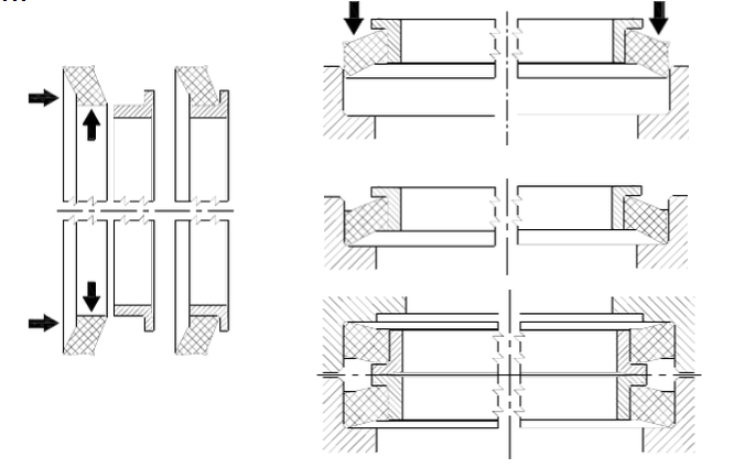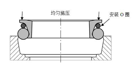 安裝時為確保安裝準(zhǔn)確到位,要求水平向下安裝,避免傾斜、垂直或向上倒裝。如圖,建議使用安裝工具,將安裝工具套在浮動密封環(huán)外圓處,將O型密封圈水平對準(zhǔn)浮封座腔室的入口,平穩(wěn)地對安裝工具逐步施壓。安裝工具將O型密封圈保持浮動密封環(huán)背錐面底部,使其外徑保持小狀態(tài)。這樣O型圈可以比較容易滑入浮封座腔室。并避免了密封面和O型密封圈被戳傷劃傷。缺少安裝工具時,也可使用較細(xì)較硬的O型密封圈代替安裝工具。