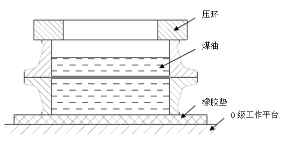 可以采用如圖方法,將成對清潔的浮封環對合好放在0級平臺,底部可加橡膠墊或涂抹油脂,頂部加上配重的壓環,倒入適量煤油,要求十分鐘沒有泄漏或滲油。
